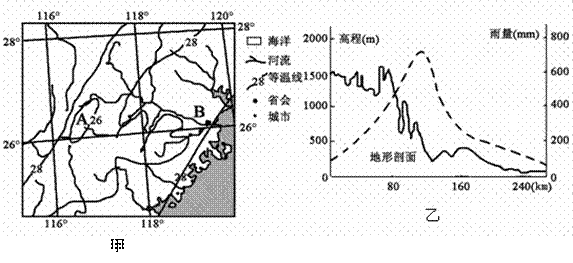 (1)乙图大致为甲图从A至B一线附近地形剖面图,若图中虚线表示当地一次特大暴雨量分布状况,据图判断中最大暴雨量分布的地区海拔高度约为 米?(3分)