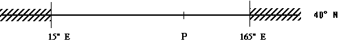 下图是某日某时刻40°N纬线的昼夜分布状况图(阴影区表示黑夜)。回答15-16题。