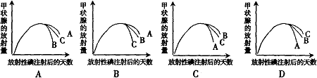 3.将含有放射性碘的注射液注射到体重和生理状况相同的A、B、C三组兔子体内,然后定时测定兔子甲状腺的放射量;4天后,向A组兔子注射无放射性的甲状腺激素,向B组兔子注射无放射性的促甲状腺激素;向C组兔子注射生理盐水。下列能正确反映三组兔子体内甲状腺放射量变化的是 ( )![]()