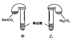 (05春北京)化学活动课上,三组学生分别用图示甲、乙两装置,探究“NaHCO3,和Na2CO3与稀盐酸的反应”,按表中的试剂用量,在相同条件下,将两个气球中的固体粉末同时倒入试管中(装置的气密性已检查)。