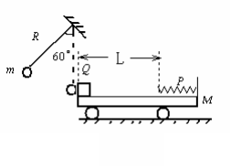17.(10分)如图14所示,质量为M的平板车右端固定一轻弹簧,弹簧下面小车表面光滑,小车左端和弹簧左端之间距离为L=2m,车表面粗糙。质量为m=1kg的小物块Q的大小不计,位于平板车的左端,系统原来静止在光滑水平面地面上。一不可伸长的轻质细绳长为R=2.5m,一端悬于Q正上方高为R处,另一端系一质量也为m的小球(大小不计)。今将小球拉至悬线与竖直位置成600角,由静止释放,小球到达最低点时与Q的碰撞时间极短,且无能量损失,碰后Q恰好返回木板左端, M:m=4:1,重力加速度为g。求: