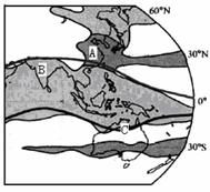 读世界部分地区图,图中阴影为地面季风的地理分布区,据此完成26-28题。