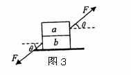 质量均为的、两木块叠放在水平面上,如图3所示,受到斜向上与水平面成角的力作用,受到斜向下与水平面成角等大的力作用,两力在同一竖直平面内,此时两木块保持静止,则 ( C )