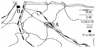 图中A城为以机电、轻纺、食品工业为主的H市的卫星城。读图完成7-8题。