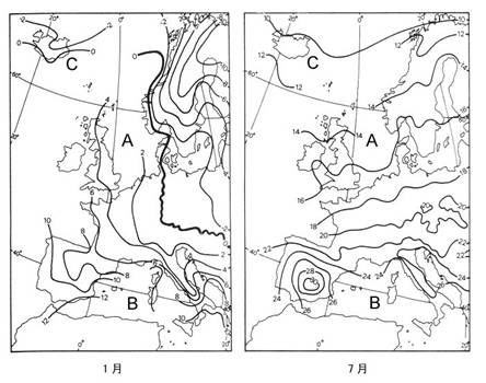 (2)比较欧洲1月、7月的气温分布规律,分析其主要形成原因。