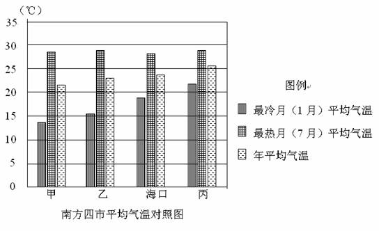 (4)丙城温度高,冬夏温差小。因为丙城纬度低,三面向海,气候的海洋性强。