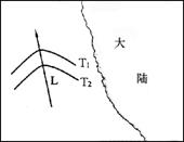 (2)在图示海域画两条过洋流L的等温线,分别标注T1和T2,其温度值关系为T1>T2,以示意该海域表层水温度的分布规律。