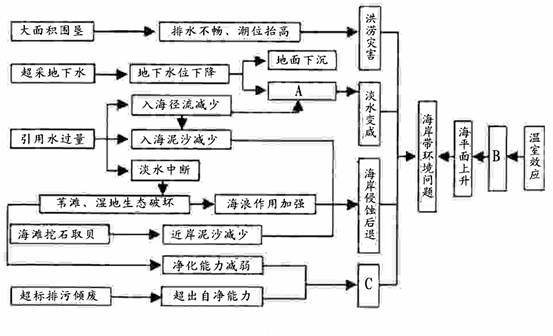 9.图为“黄河三角洲某海岸带环境问题示意图”。读图回答下列问题。