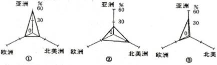 图为2002年亚洲、欧洲、北美洲(除墨西哥)的谷物进、出口量和生产量占世界的比例。据此图并结合表1完成3--5题。