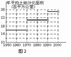 高考热点1. (2001上海,12)根据报道,我国目前已成为世界上受荒漠化危害最严重的国家之一.图2-6中(1)表示我国土地沙化总面积在上个世纪五六十年代、七八十年代、九十年代的变化情况.由图中的相关信息,可将上述有关年代中,我国年平均土地沙化面积在图1中(2)中图示为:
