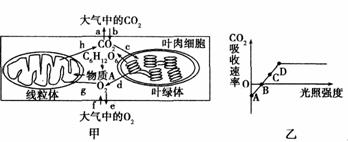 B.当光照强度处于图乙D点之后,对应图甲中的CO2的扩散途径有b、h