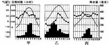 左图是拉萨、北京、长沙三地的气候资料图,分析回答21-24题: