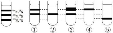 细菌在15N培养基中繁殖数代后,使细菌DNA的含氮碱基皆含有15N,然后再移入14N培养基中培养,抽取其子代的DNA经高速离心分离,下图-…为可能的结果,下列叙述错误的是![]()