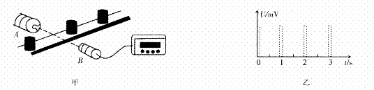 利用光敏电阻制作的光传感器,记录了传送带上工件的输送情况,如图甲所示为某工厂成品包装车间的光传感记录器,光传感器B能接收到发光元件A发出的光,每当工件挡住A发出的光时,光传感器就输出一个电信号,并在屏幕上显示出电信号与时间的关系,如图乙所示。若传送带始终匀速运动,每两个工件间的距离为0.2m,则下述说法正确的是( )![]()
