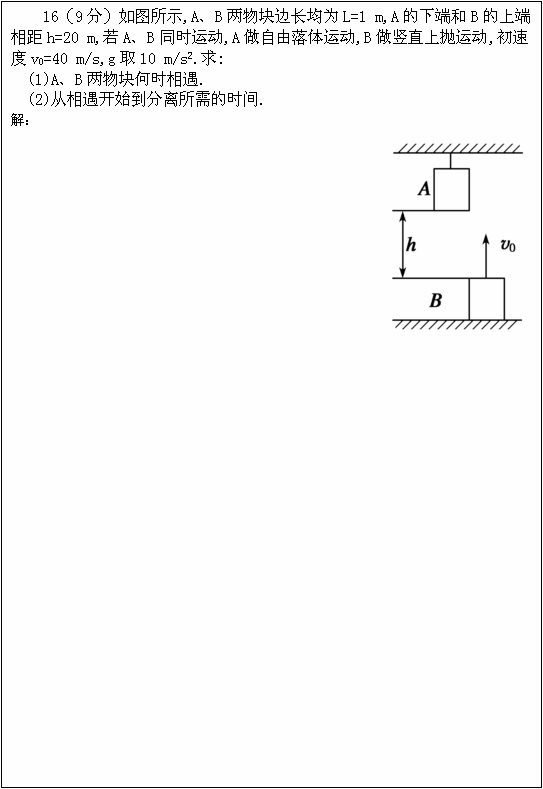 16、(9分)如图所示,A、B两物块边长均为L=1