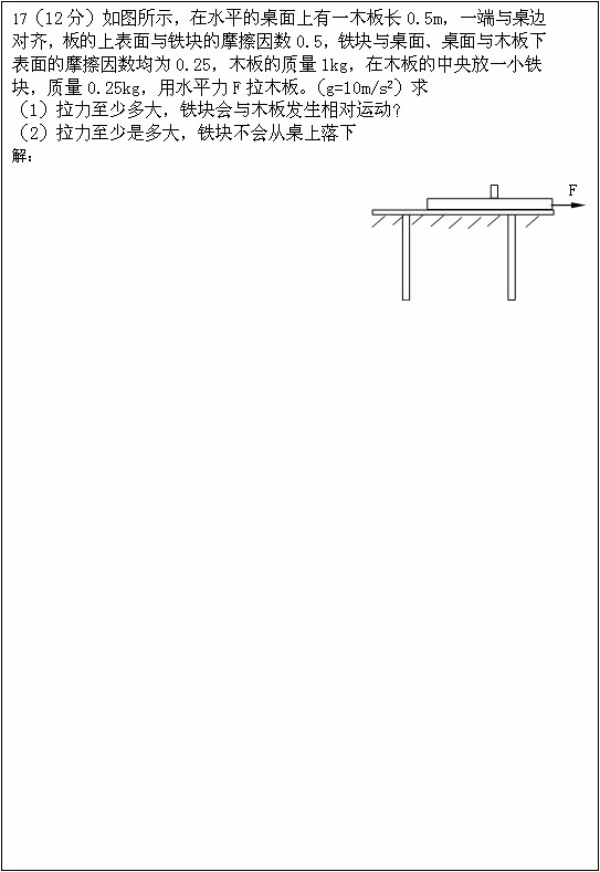 质量为m的木块在水平恒力F的作用下沿着质量为M=3m的木板滑行,长木板放在水平地面上,一直处于静止状态。若![]()