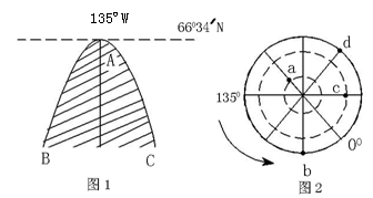 (1)此时太阳直射点的地理坐标为 ,请把图1的昼夜状况转绘到图2,(黑夜用阴影表示),并标出太阳直射点M。