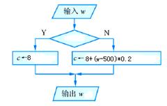移动公司出台一项新的优惠政策:若顾客该月接听电话时间在500分钟以内,则收取8元的费用,超过500分钟的,按超过部分每分钟0.2元计(不足1分钟按1分钟计)。根据下面的流程图,空白处应填写的语句是________________