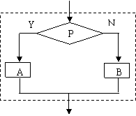 上述算法过程中,先根据条件作出判断,再决定执行哪一种操作的结构称为选择结构(selection structure)(或称“分支结构”)。如下图中,虚线框内是一个选择结构,它包含一个判断,当条件p成立(或称为“真”)时执行A,否则执行B。在A和B中,有且只能有一个被执行,不可能同时被执行,但A和B两个框中可以有一个是空的,即不执行任何操作。