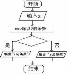2、下边的流程图(如图所示),能判断任意输入的数x的奇偶性,其中判断框内的条件是 .