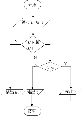 算法:将a与b进行比较,将大的数放入一个临时变量Max中,再将Max与c比较,输出大的数。