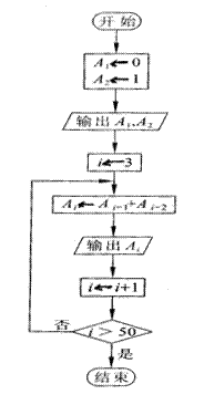 例2 斐波拉契数列表示的是这样的一列数:0,1,1,2,3,5,…,后一项等于前两项的和。设计一个算法流程图,输出这个数列的前50项。