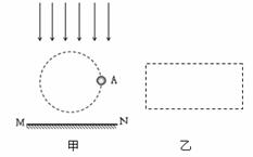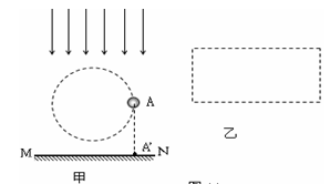 .如图甲所示,一束平行太阳光垂直水平地面MN射下,A为小铁球。⑴标出小铁球A在甲图中位置时,其影子A′在地面MN上的位置(用点表示即可);⑵若小球在竖直平面内沿图中圆形虚线轨迹运动,请在图乙框中画出小球的影子在地面上运动的轨迹。