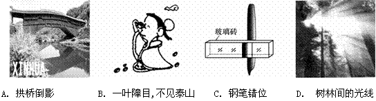 A.笔“断”了 B.水中倒影 C.邮票放大 D.手影
