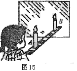 (09威海).小强在探究平面镜成像特点实验时,取两段等长的蜡烛A和B一前一后竖放在直尺上,点燃玻璃板前的蜡烛A,观察玻璃板后的像,如图15所示,两段等长的蜡烛是为了比较物与像的 关系,移去蜡烛B,并在其所在位置上放一光屏,则光屏不能接收到蜡烛A的烛焰的像,这说明平面镜成的像是 像。