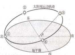 右图为某地一天中太阳视运动轨迹,当北京时问6点时,太阳运动至③点,测得当时太阳高度角为40°。读图回答5-7题