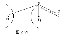 如图2-23,定点F1、F2是两个按钉,MN是一个细套管,两条细绳分别拴在按钉上且穿过套管,点M移动时,|MF1|-|MF2|是常数,这样就画出曲线的一支;由|MF2|-|MF1|是同一常数,可以画出另一支.