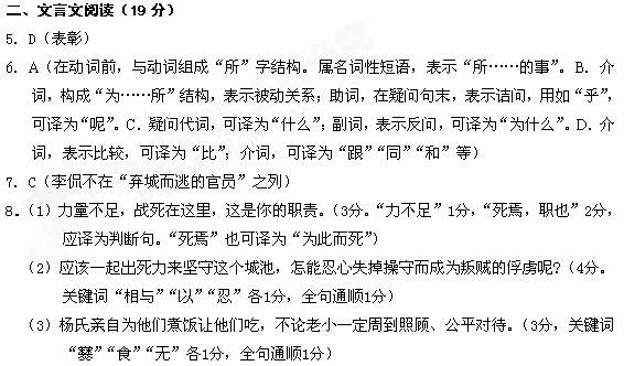 县令李侃不知所措。他的妻子杨氏说: “你是县令,叛贼到犯就应当坚守;力量不足,战死在这里,这是你的职责。你如果逃跑,那么谁来守城呢?”李侃说:“军队与钱财都没有,该怎么办?”杨氏说:“如果不坚守,县城将会被叛贼抢夺去了。粮仓里储藏的都成了他们的粮食,府库的财物都成了他们的财产,百姓都成了他们的士兵,国家还有什么呢?把可能落入叛贼手中的财物夺过来,吃他们的粮食,重赏鼓励敢死的士兵,那一定能成功的。” 于是在官府的庭院里召集差吏百姓。杨氏说:“县令确实是一城之主,虽然如此,任期满了就离职而去,不像差吏百姓那样。差吏百姓,都是本地人,祖坟在这里,应该相互出死力来坚守这个城池,怎能忍心失掉操守而成为叛贼的俘虏呢?”众人都流泪答应了。于是杨氏宣布号令说:“凡是用砖瓦石块击中叛贼的,奖赏他千钱;用刀箭兵器击中叛贼的,奖赏他万钱。”征募到了数百人,李侃带领他们登上了城墙。杨氏亲自为他们煮饭让他们吃,不论老小一定周到照顾、公平对待。杨氏让李侃对城下的敌人喊话说:“我们项城的父老,坚守道义而决不从贼,都全力死守。即使攻克了我们的城池也不能显示你们的军威,不如赶快离去;白白地消耗军力,没有什么好处。”叛贼都笑了。这时有流矢射中李侃的手,李侃受伤而归。杨氏责备他说:“你不在,那么谁还会固守阵地呢!你即使死在城上,岂不是胜过死在家里吗?”李侃就忍着伤痛,又登上了城墙。