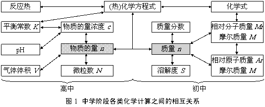 中学化学计算所包含的内容比较广,因此,化学计算考查的知识点也比较多。倘若稍加分析,可以发现,中学阶段所有的化学计算都是以2个基本物理量--物质的量和质量为核心结合化学概念和化学用语等而展开的(图1)。