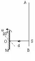的距离为d。光屏AB与平面镜的初始位置平行。当平面镜M绕垂直于纸面过中心O的转轴以ω的角速度逆时针匀速转过300时,垂直射向平面镜的光线SO在光屏上的光斑P的即时速度大小为 。