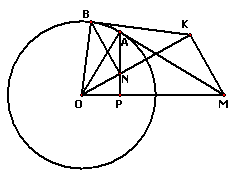 (几何证明选讲选做题)如图,过圆O外一点M作它的一条切线,切点为A,过A作直线AP垂直直线OM,垂足为P;N为线段AP上一点,直线NB垂直直线ON,且交圆O于B点;过B点的切线交直线ON于K,则∠OKM = .