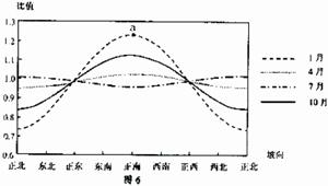图6表示27°N某地坡向(坡度为10°)对地表获得太阳辐射的影响,纵坐标表示该地坡面与地平面获得太阳辐射量的比值(仅考虑地球运动和地形因素)。完成10~11题。