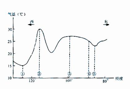 下图是沿36度纬线某月平均气温曲线图,读图回答12-14题。