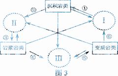 图3为岩石圈物质循环示意图,图中Ⅰ、Ⅱ、Ⅲ分别代表沉积环境、熔融环境和变质环境,箭头线代表不同的地质过程。读图回答24--25题。