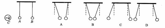 7.如图左图所示,A、B为两个用绝缘细线悬挂起来的质量相同的带电小球,左边放一个带正电的球C时,两悬线都保持竖直方向(两线长度相同).若把C球移走,两球没有发生接触,那么右面四个图中,哪个图可以正确表示A、B两球的位置( )