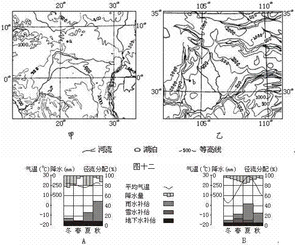 27.读“两地区等高线分布示意图”,以及流经两地区主要河流流域的“气温曲线和降水柱状图”“径流季节分配和补给类型图”,回答有关问题。(14分)