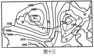 (12分)读“我国部分地区某时地面天气形势图”(图十三),回答下列问题。