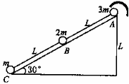 18. 如图所示,质量分别为3m、2m、m的三个小球A、B、C用两根长为L的轻绳相连,置于倾角为30°、高为L的固定光滑斜面上,A球恰能从斜面顶端外竖直落下,弧形挡板使小球只能竖直向下运动,小球落地后均不再反弹.由静止开始释放它们,不计所有摩擦,求: