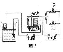 如图3所示是一个水位自动报警器的原理图。水位没有到达金属块A时,绿灯亮;水位到达金属块A时,红灯亮。下列关于它的