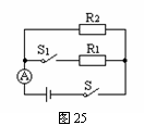 如图25所示电路中,电源电压保持6V不变。(1)当闭合开关S,断开开关S1时,电流表的示数为0.1A,求电阻R2的阻值; (2)当同时闭合开关S和S1时,电流表的示数为0.3A,求电阻R1消耗的电功率。