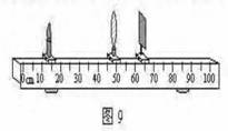 (2) 小华同学将蜡烛、凸透镜、光屏依次放在光具座上,如图9 所示,并使烛焰、凸透镜、光屏三者的中心在同一高度上,实验过程中凸透镜保持在光具座上50cm的位置处不变。将烛焰移动到光具座上的15cm位置处,当光屏在光具座60-70cm间的某位置时,光屏将会接到烛焰的像,该像与物比较有什么特点?应用这一原理可以制成什么光学仪器?