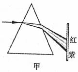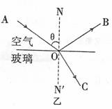 (3分)如图甲所示,一束白光经三棱镜折射后,在光屏上形成自上而下为红、橙、黄、绿、蓝、靛、紫的色带,这就是光的__________现象。一束红光沿AO从空气斜射向玻璃,OB和OC分别是红光的反射光线和折射光线,如图乙所示。如果一束紫光也沿A0斜射向玻璃,请你在图乙中画出该紫光的折射光线(大致位置)和反射光线,并标出传播方向。