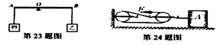 23.如图所示,O为杠杆AB的支点,OA:0B=2:3.物块甲和乙分别在杠杆A、B两端,杠杆平衡。已知物块甲和乙体积相等,那么物块f甲和乙的质量之比是 .若物块甲的密度ρ甲=6.0×I03Kg/m3,则物块乙的密度ρ乙= kg/m3