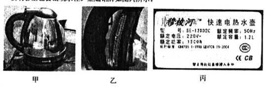 34.小亮和爸爸外出旅游入住兴凯湖宾馆,房间内漂亮、精致的电热水壶引起了小亮的兴趣,电热水壶如图甲所示,小亮对电热水壶做了细致的观察,在壶体外侧靠近壶把处有一透明有机玻璃管,下部与壶体相通,如图乙所示,当向壶内注水时,有机玻璃管里也会出现水柱,壶底铭牌如图丙所示.