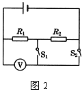 如图2所示电路,电源电压恒定不变.当S1闭合、S2断开时,电压表的示数为3 V;当S1断开、S2闭合时,电压表的示数9 V,则R1︰R2为( )。![]()