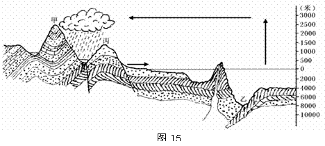 (7分)图15为“亚欧大陆东岸某地海陆分布剖面示意图”,读图回答下列问题。